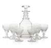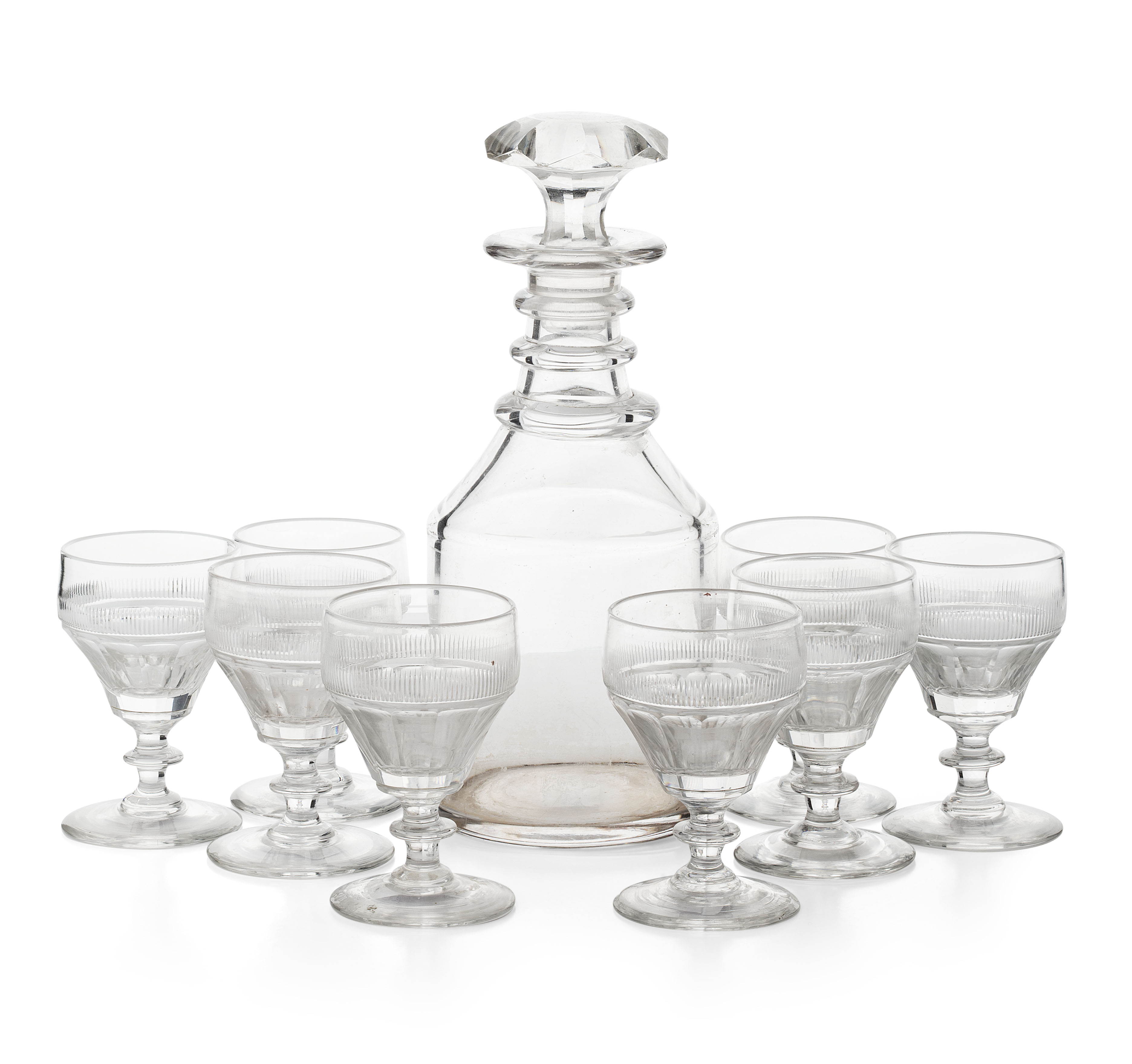 with cut and faceted conical cups, on a knopped stem and circular foot, 10cm high; together with a REGENCY GLASS DECANTER, of mallet form with a triple ring neck and faceted stopper, 29cm high (9)