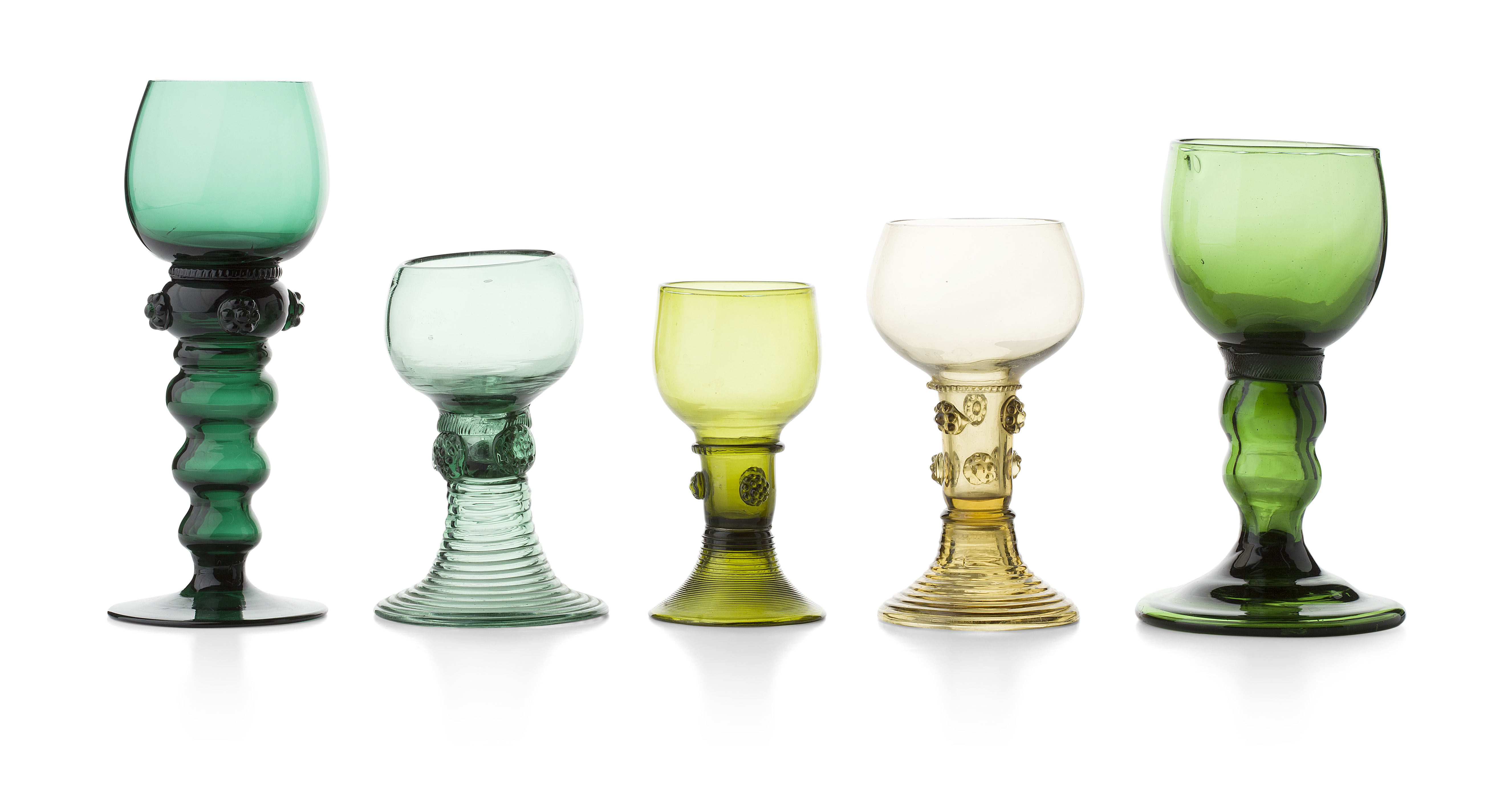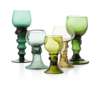 comprising six sets of various size, shape, colour and quantity, some with prunt decorated stems (qty)
