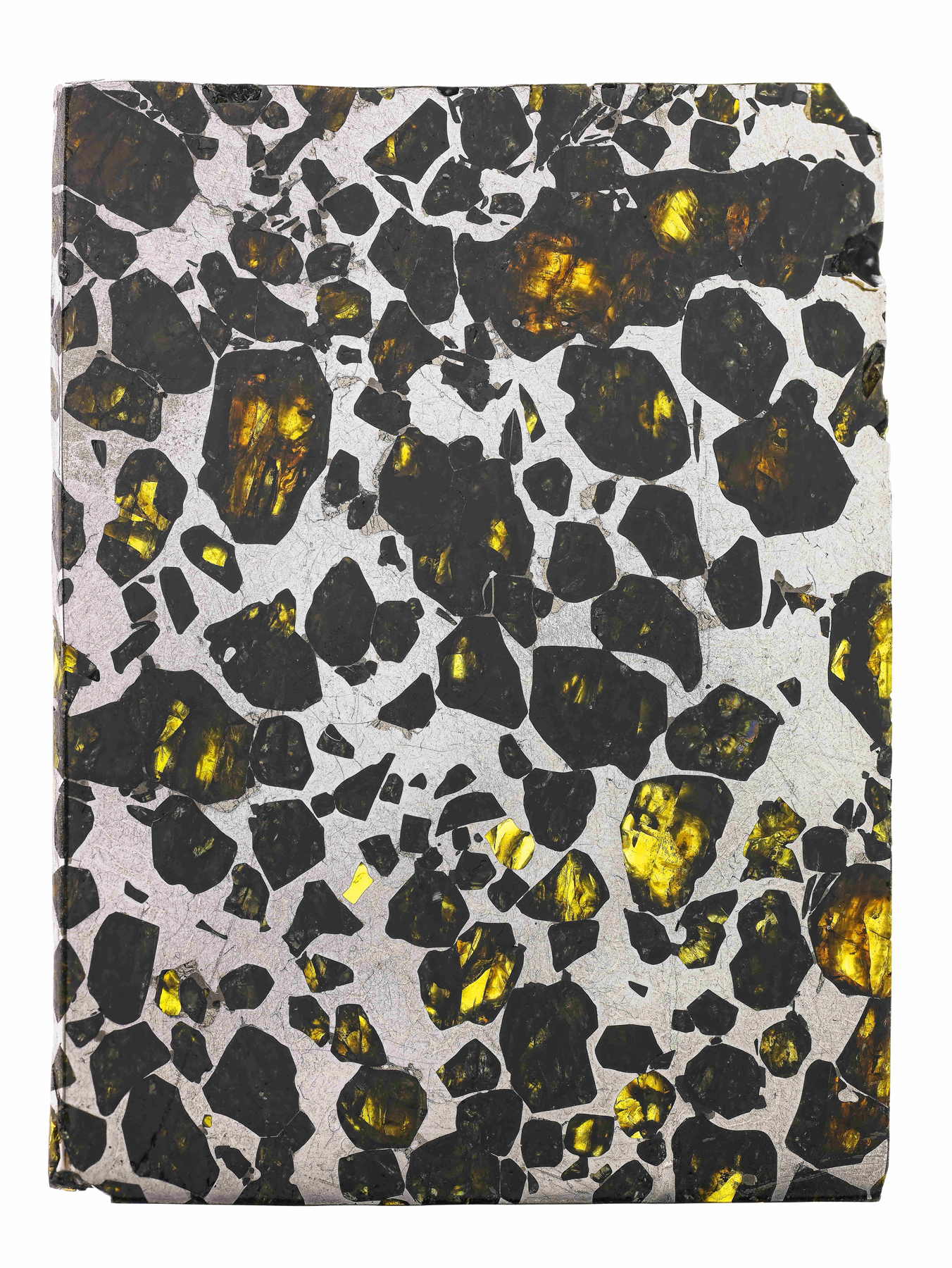 Thinly cut Esquel slices are translucent, allowing light to pass through the olivine crystals like a stained glass window.