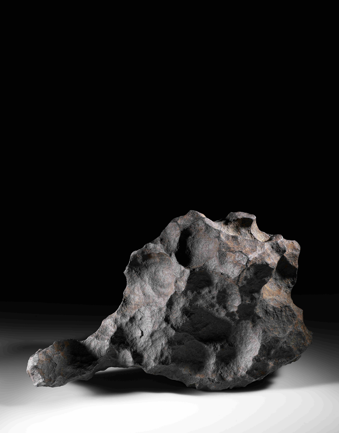 When cut, polished and etched with acid, Gibeon reveals a beautiful and unique pattern called Widmanstatten figures - a crystal structure formed by nickel-rich and nickel-poor metallic bands as a result of an extremely low rate of cooling over thousands/millions of years. This Widmanstatten structure is absolute proof of a meteoric origin for many iron meteorites, as it is not something that can be copied or forged in a lifetime. Complete Gibeon meteorites exhibit large surface regmaglypts (thumbprint-like impressions) and twisted features, all evidence of being sculpted by a violent atmospheric passage.