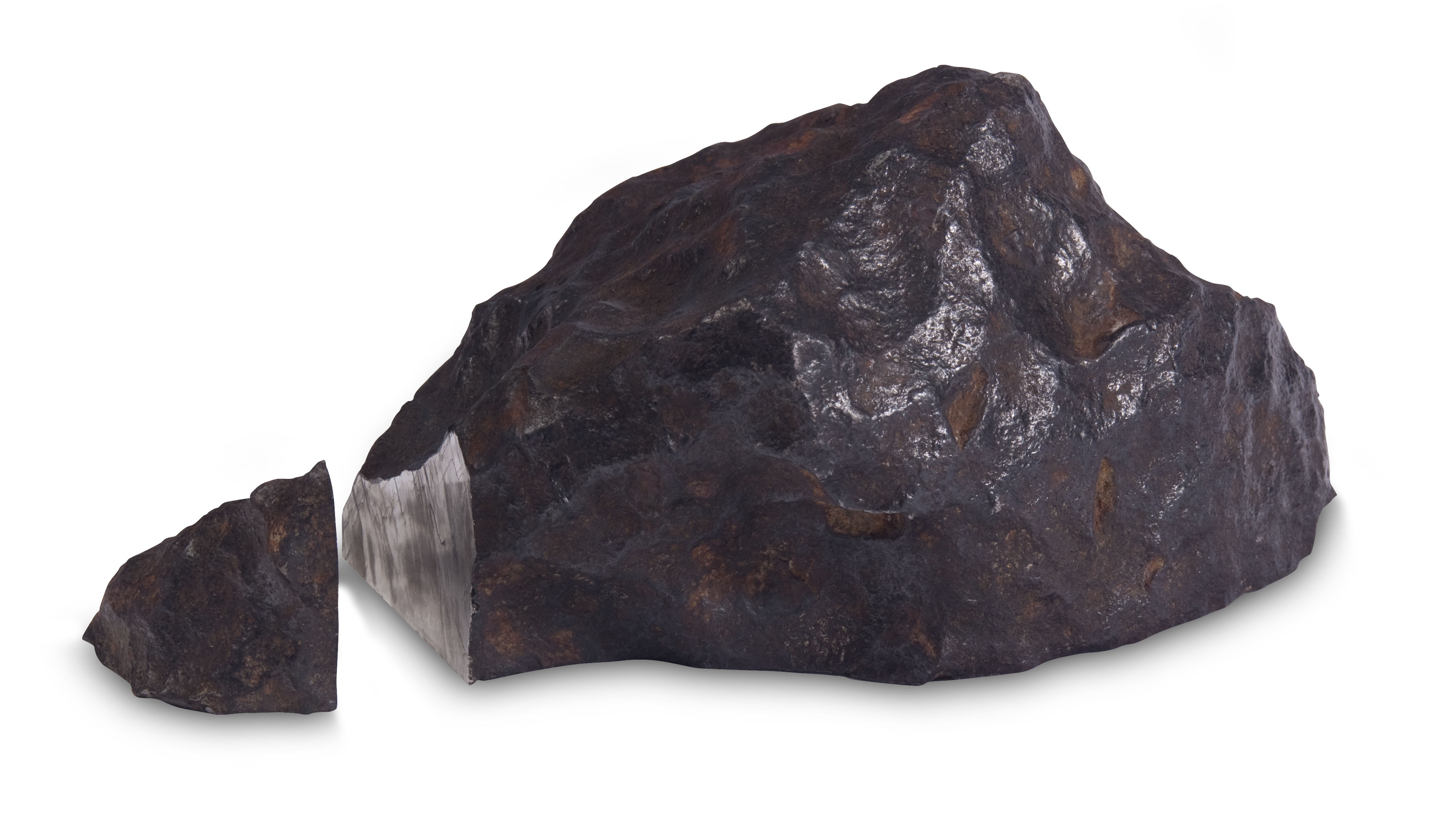When cut, polished and etched with acid, Gibeon reveals a beautiful and unique pattern called Widmanstatten figures - a crystal structure formed by nickel-rich and nickel-poor metallic bands as a result of an extremely low rate of cooling over thousands/millions of years. This Widmanstatten structure is absolute proof of a meteoric origin for many iron meteorites, as it is not something that can be copied or forged in a lifetime. Complete Gibeon meteorites exhibit large surface regmaglypts (thumbprint-like impressions) and twisted features, all evidence of being sculpted by a violent atmospheric passage.