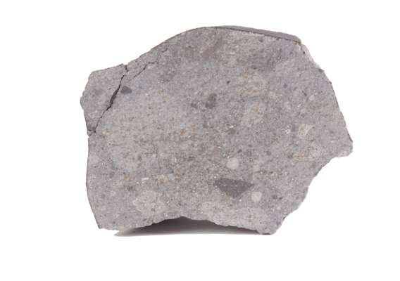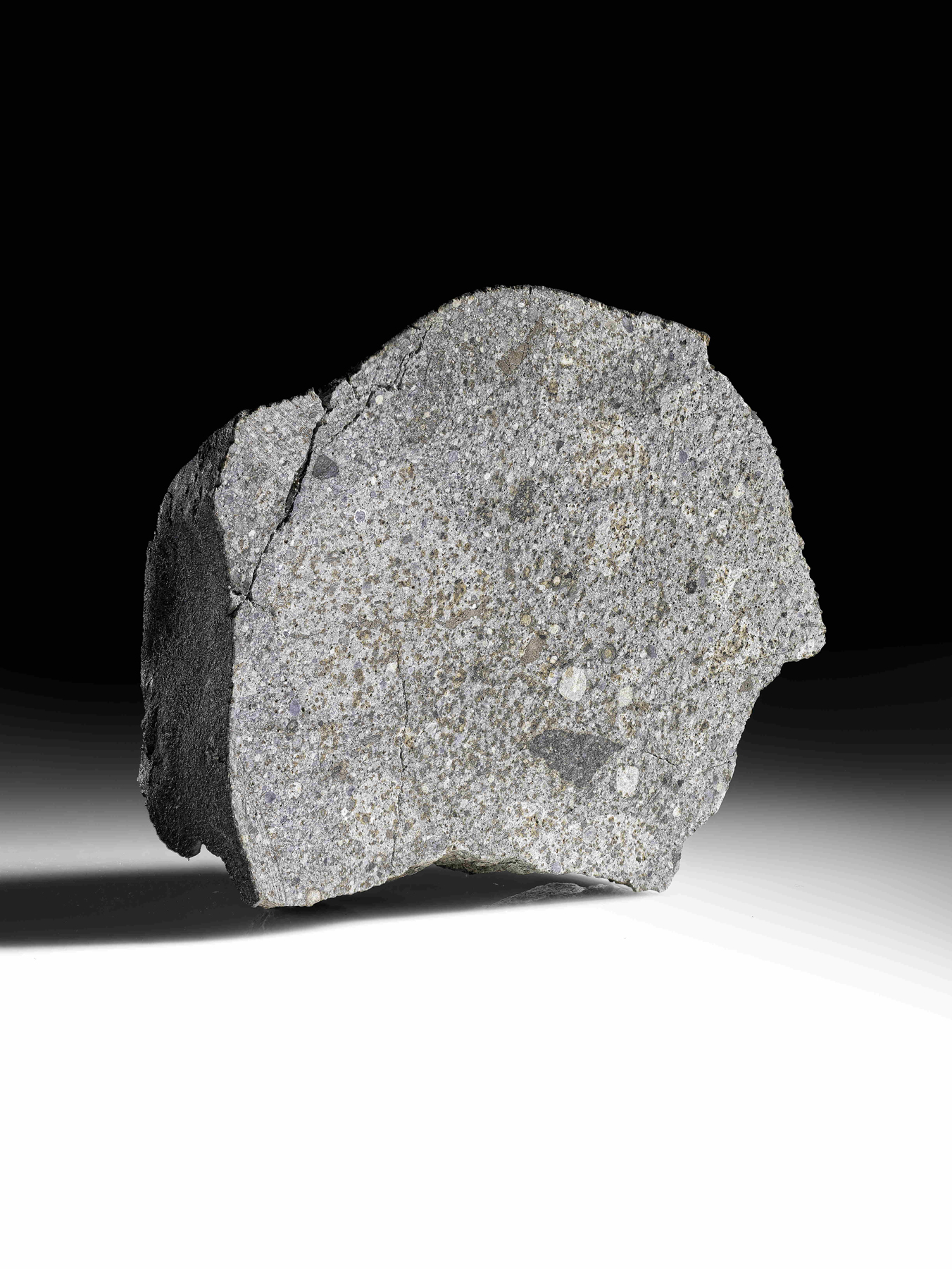 This is a classic example of a regolith breccias: a host material containing broken up, angular clasts of stony material, with their sharp points smoothed by the bombardment of a myriad micrometeoroid impacts at the surface of the parent asteroid from which it came.