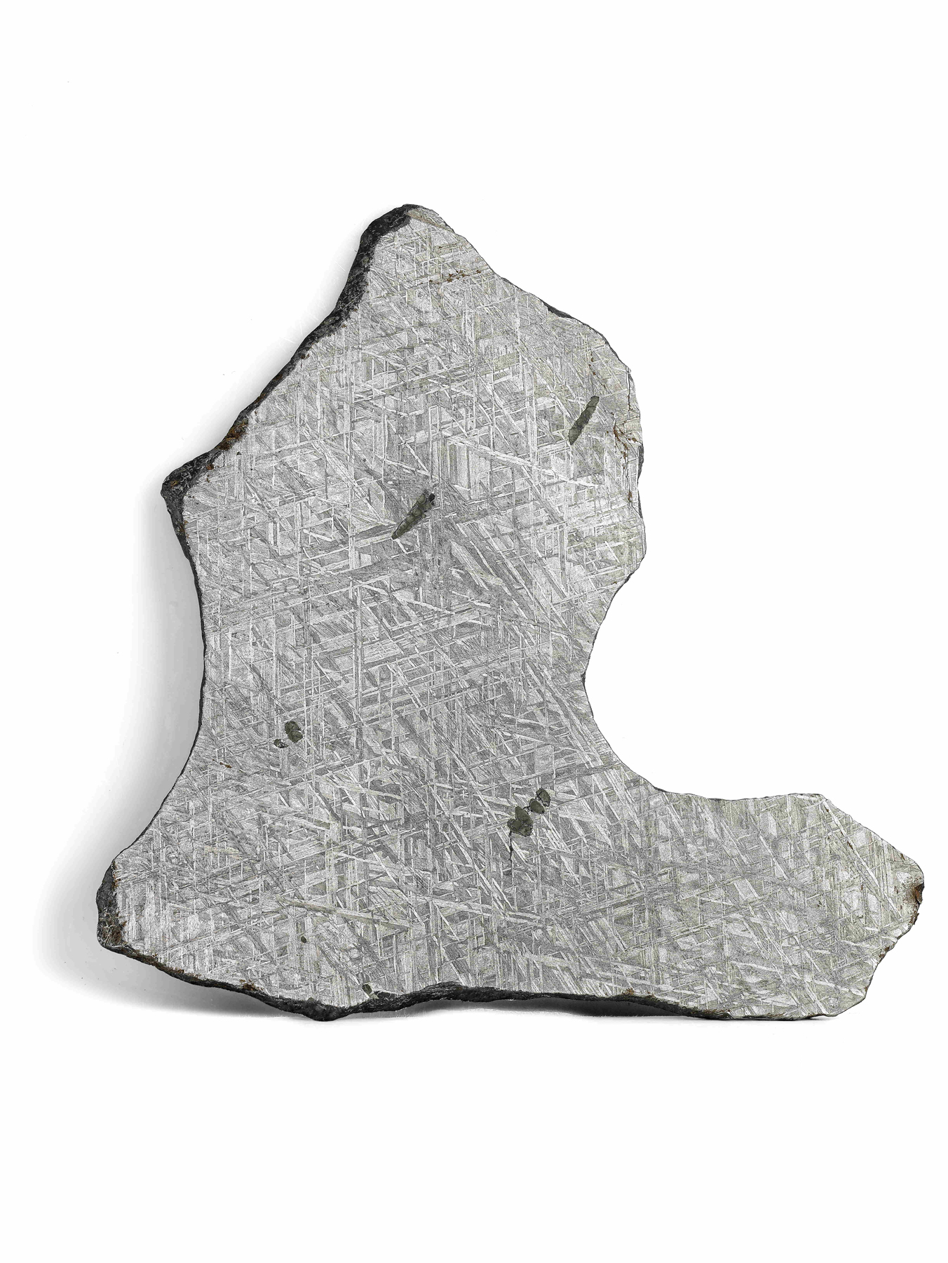 When cut, polished and etched with acid, Gibeon reveals a beautiful and unique pattern called Widmanstatten figures - a crystal structure formed by nickel-rich and nickel-poor metallic bands as a result of an extremely low rate of cooling over thousands/millions of years. This Widmanstatten structure is absolute proof of a meteoric origin for many iron meteorites, as it is not something that can be copied or forged in a lifetime. Complete Gibeon meteorites exhibit large surface regmaglypts (thumbprint-like impressions) and twisted features, all evidence of being sculpted by a violent atmospheric passage.