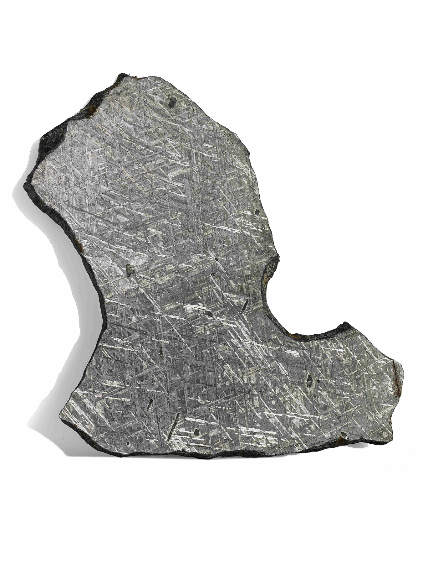 When cut, polished and etched with acid, Gibeon reveals a beautiful and unique pattern called Widmanstatten figures - a crystal structure formed by nickel-rich and nickel-poor metallic bands as a result of an extremely low rate of cooling over thousands/millions of years. This Widmanstatten structure is absolute proof of a meteoric origin for many iron meteorites, as it is not something that can be copied or forged in a lifetime. Complete Gibeon meteorites exhibit large surface regmaglypts (thumbprint-like impressions) and twisted features, all evidence of being sculpted by a violent atmospheric passage.
