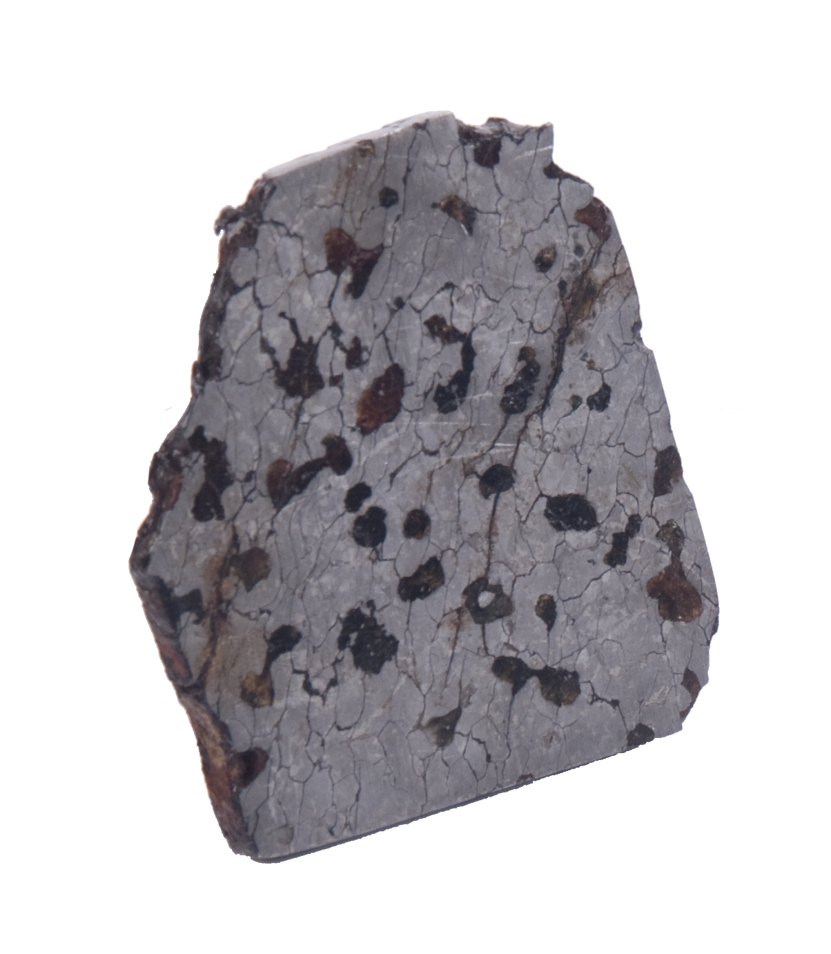 Found on open farm shrub land in 1992, this iron meteorite contains dark silicate inclusions mixed within a bright nickel-iron matrix.