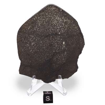 The dark matrix reveals many small chondrules, some shock veining and a surprising amount of fine-grained metal flake.