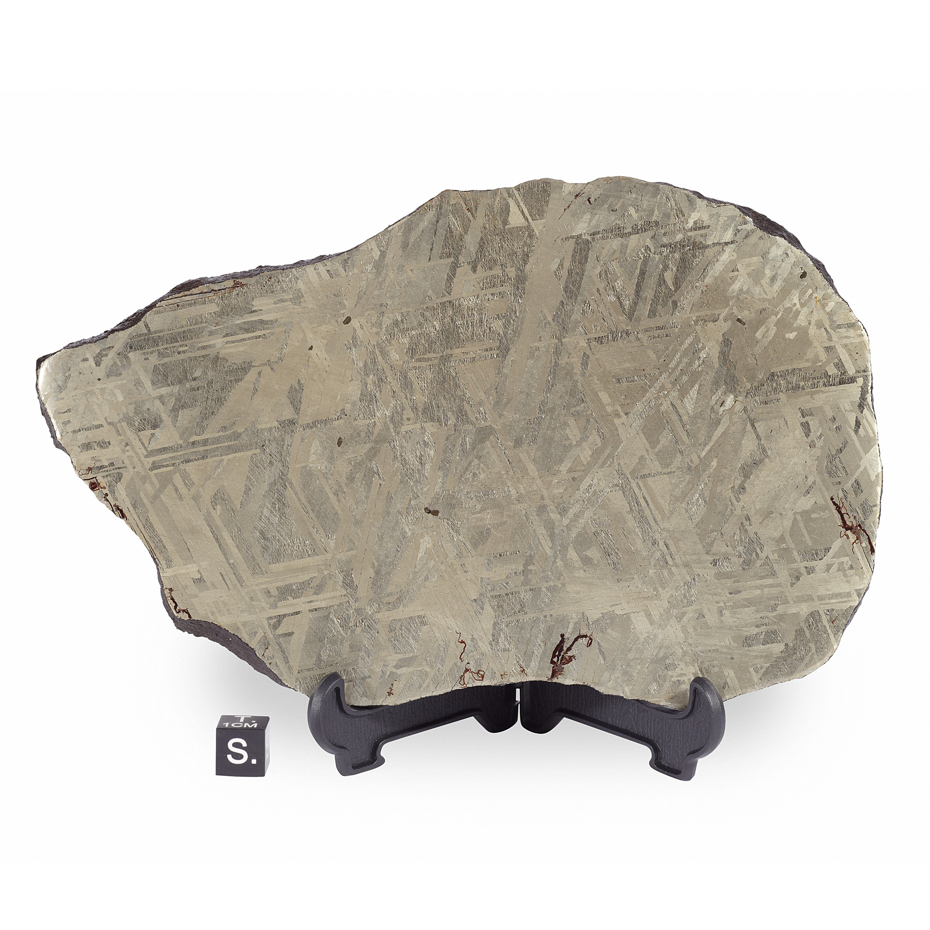 This beautiful slice has an edge of natural crust, and has been etched with weak acid to reveal the Widmanstatten crystal structure.