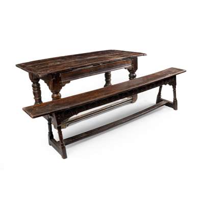 with plain frieze, turned legs, united by stretchers, together with an oak long bench, the moulded top over a lunette carved frieze, on turned legs united by turned stretchers (2)