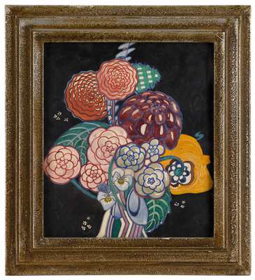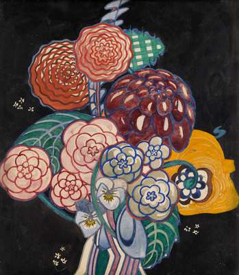 Mackintosh produced a series of paintings of stylised bouquets of flowers on a black background, probably around 1918-20. The format is unsuited for use as a textile pattern, of which he designed a considerable number at this time, and it seems probable that he produced them for sale as pictures in their own right. They combine the deliberation of the later flower paintings with the formal patterns and stylisation of flowers of his textile designs.
