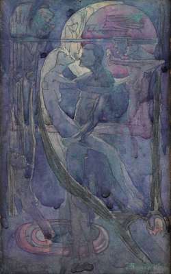 One of the earliest Spook School watercolours where MacNair establishes his own vocabulary of menacing figures with an amalgam of erotic and threatening imagery. The drawing features colours that were to become a staple of the palette of The Four over the next few years, eerie blues and greens that contain their own powerful symbolism. The compositional scheme, of central figures framed by other indeterminate human forms, arranged as a framework in turn supporting, then attacking the main protagonists. This tension, combined with the sensual nature of the central pose, was to characterise much of the related work of the next four years.