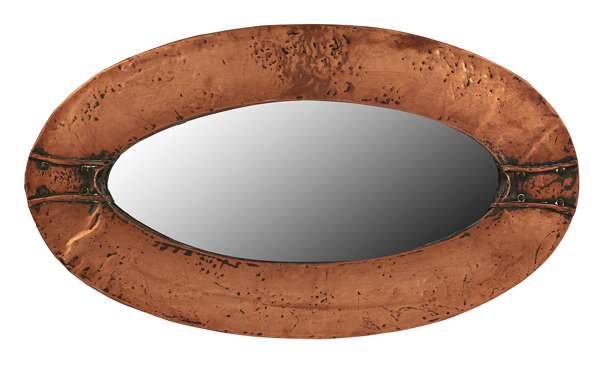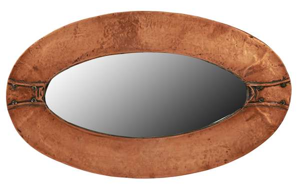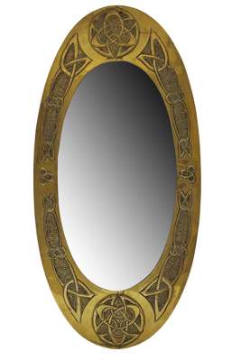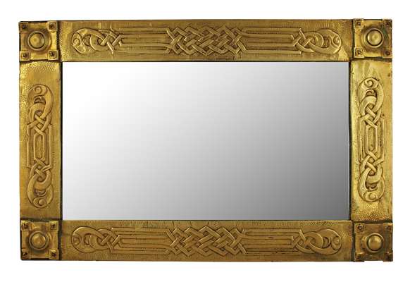 of oval form, the frame embossed and chased with Celtic knot work, enclosing a later mirrored plate, 85 x 41cm (33½ x 16in); another SCOTTISH CELTIC REVIVAL BRASS FRAMED WALL MIRROR, of rectangular form, with embossed and chased Celtic decoration, 57 x 36.5cm (22½ x 14in); and a pair of OVAL COPPER WALL MIRRORS, each with strapwork decoration, 38cm (15in) x 22cm (8 1/2in) high (4)