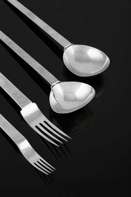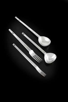 In 1902 Jessie and Fra Newbery commissioned from Mackintosh a design for a twelve place setting of dining cutlery, each set containing a soup spoon, dessert spoon, dinner fork and dessert fork (knives were supplied separately from a stock pattern). The commission was handled by a jeweller's in Glasgow, Edwards & Company, and the cutlery was made by D W Hislop, a Glasgow silversmith who worked with Mackintosh on other projects. All of the cutlery was later divided equally between the Newberys' daughters, Mary and Elsie; Mary's pieces were sold separately during the 1970s and 1980s.
