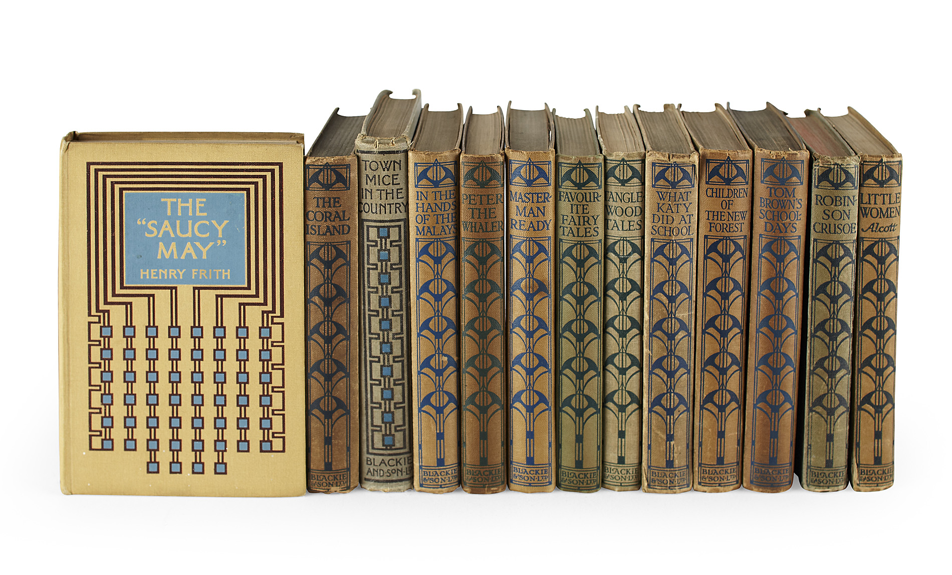 featuring the work of Charles Rennie Mackintosh, Margaret Macdonald Mackintosh and Frances MacNair, printed paper wrappers, some staining to top RH corner; CHARLES RENNIE MACKINTOSH (1868-1928) (DESIGNER), THE CORAL ISLAND, published Blackie & Son Ltd, the front cover and spine with trellis repeat stylized Glasgow style motifs; another 11 with matching design; and another with orange cloth similar; CHARLES RENNIE MACKINTOSH (1868-1928) (DESIGNER), TOWN MICE IN THE COUNTRY, the front cover and spine with Modernist design; and another book with matching designs 'The Saucy May'; TALWIN MORRIS (DESIGNER), THE STUDENT'S ENGLISH DICTIONARY; CHILDREN OF THE NEW FOREST and DECISIVE BATTLES, and 13 other Blackie's titles with Art Nouveau cloth bindings; also JESSIE MARION KING (DESIGNER), GLASGOW, CITY OF THE WEST; THE GREY CITY OF THE NORTH (2 copies); and THE CITY OF THE WEST (34)