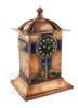 with domed lantern pediment having applied red enamel bands over Celtic cross design enamelwork with central circular dial, painted Arabic numerals, the base of the cross decorated with two figures, one playing a pipe, the sides with panels of fairies and enamel inscription NOW THE BRIGHT MORNING STAR COMES DANCING FROM THE EAST, AND RAPT THRO’ MANY A ROSY CHANGE THE TWILIGHT DIED INTO THE BANK, raised on spreading rectangular plinth (alterations)