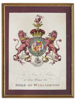 each reserved on turned, ebonised wooden frames, 22cm diameter; together with a framed hand coloured print of the arms of the 1st Duke of Wellington, 29 x 21cm (3)