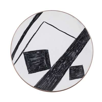 Barns-Graham made a point of always having Adams’ work on display, and on moving into her new studio at Barnaloft on Porthmeor Beach in St Ives in 1963, the ceramic plate by him was the first thing hung in her new home. This plate is particularly noteworthy within Adams’ oeuvre in indicating his development to abstract art. Through the 1950s he taught at the Central School of Art and Design in London, coming into contact with Victor Pasmore and artists such as Kenneth Martin and Mary Martin who were pursuing abstract and constructivist ideas in Britain at this point, and it was at this time he loosely joined in the activities of this liked-minded group, remaining allied to them until around 1956. During this period Adams sent both paintings and sculptures to group exhibitions of their work and it is likely that this ceramic could have been among these works, specifically as Pasmore and Kenneth Martin were also known to have made designs for plates, some being exhibited at the Redfern Gallery in May 1952.
