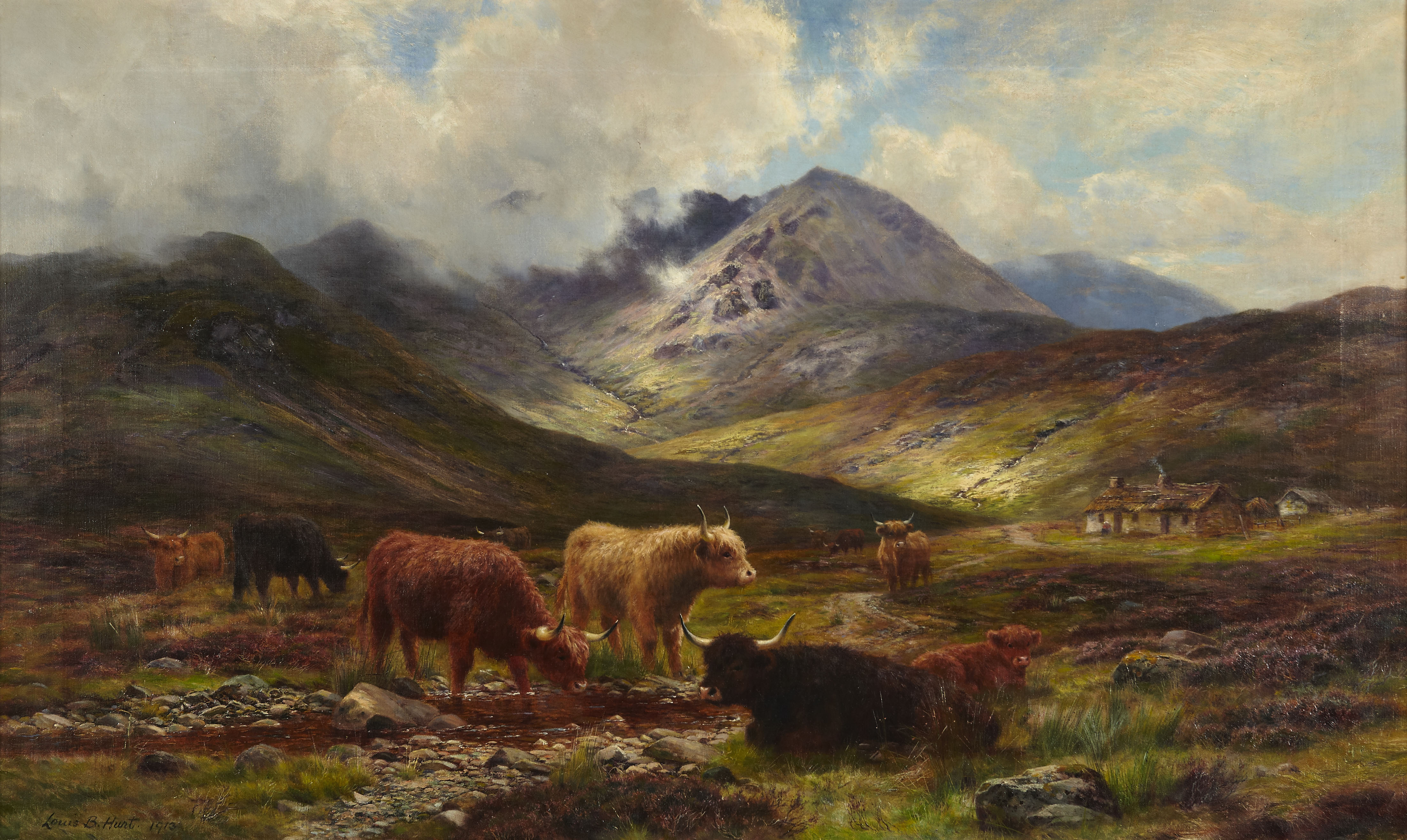 HIGHLAND CATTLE WATERING IN A MOUNTAIN GLEN