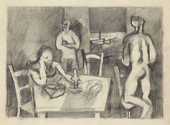 THREE FIGURES ROUND A TABLE