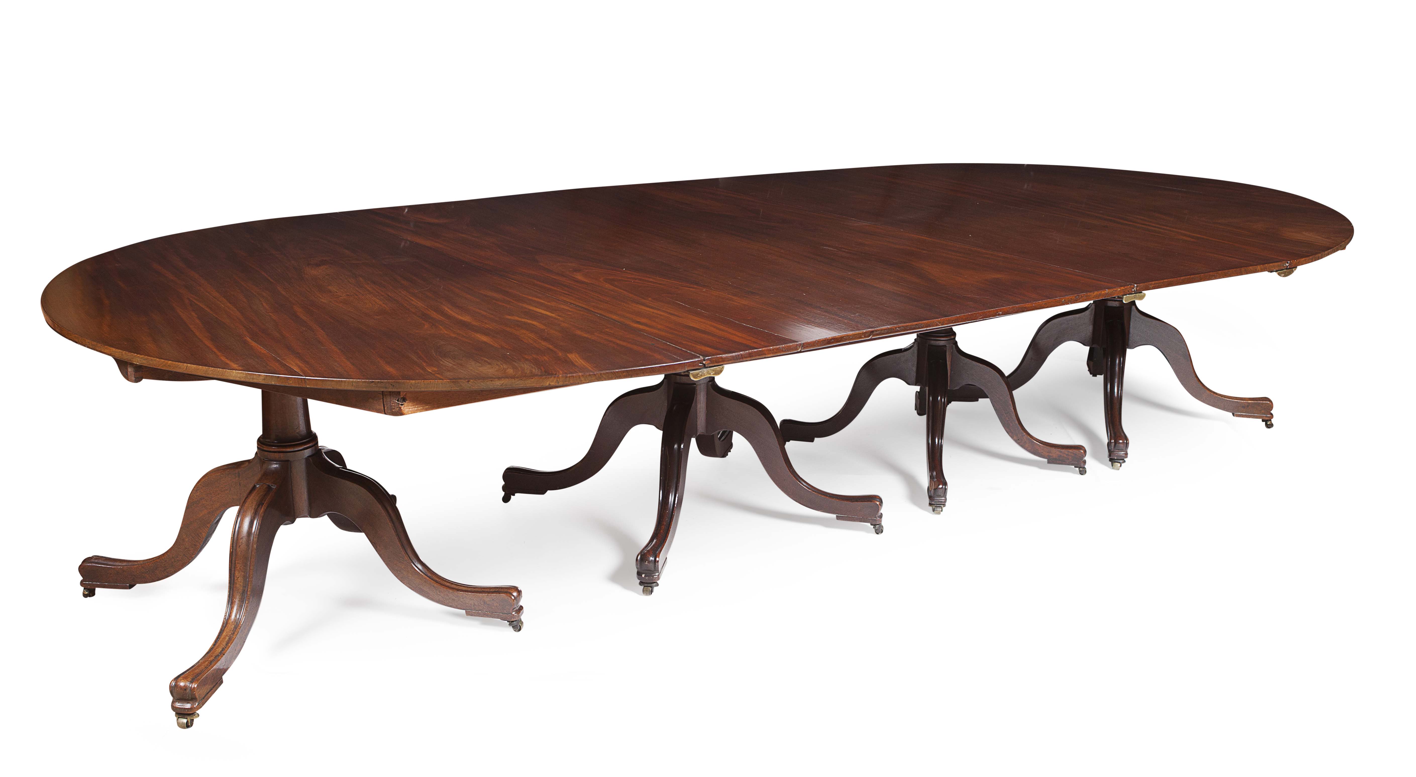 The design of this table is similar to the dining table from Blair Castle, sold in these rooms 14th March 2012, lot 292, except that the present lot has the addition of a chamfered moulding on the legs and castors to the feet. The Blair table was similar to one supplied by Gillows to Hugh Montgomerie, 12th Earl of Eglinton, for Eglinton Castle, Ayrshire, circa 1800 and now in Dumfries House. The same pattern was also made for Bellamour, Staffordshire in 1798 by cabinet-maker George Atkinson, who executed a number of similar dining tables for Gillows between 1790 and 1802.