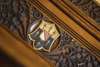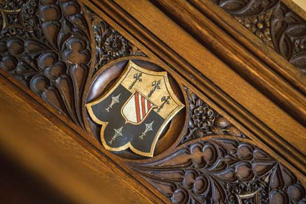 The sideboard is embellished with painted coats of arms, all of which pertain to the Lovelace lineage. This style of embellishment relates to furniture designed by Pugin and most particularly to his large bookcase, designed for the Great Exhibition of 1851, and his own dining room cabinet of 1845, both of which incorporate similar shields relating to the owner. The shields here date from after 8th July 1835, when William King, then 8th Baron King of Ockham, married the Hon. Augusta Ada Byron. The top row from left to right show the arms of Troye; the Noel family; King with Byron in pretence; and Lovelace (Barons 1627-1737); and the two lower shields denote Byron and Wentworth. This sideboard was likely to have been made after 1846 when the 1st Earl of Lovelace started living at Horsley and before 1860 when he adopted the name and arms King-Noel by royal licence.