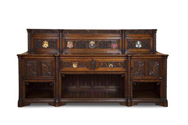 This fine sideboard shows similarities to examples by J. C. Crace, prominent London interior decorator of the mid-19th century, and collaborator of A. W. N. Pugin. Crace's association with Pugin is well documented, most notably their work on the interiors of the Palace of Westminster, and the firm continued to make furniture to his designs long after his death in 1852. Crace showed an elaborate sideboard at both the Paris Exhibition in 1855 and the second London Exhibition of 1862 and there are also examples of sideboards by Crace, which rely heavily on Pugin's designs, at Lismore Castle, Co. Waterford, Abney Hall in Cheshire and at Tyntesfield in Somerset. The panelling on this example is reminiscent of designs used in the Palace of Westminster and illustrated in 'True Principles' (1841).
