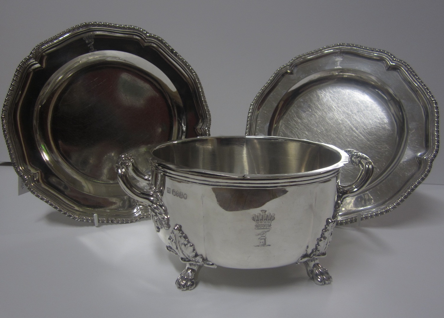 of circular form, gadroon border, engraved crest to the bouge; and a TWO HANDLED SERVING DISH, makers mark erased, leaf clasped legs and handles (3)
