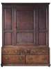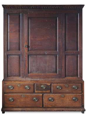 the carved cornice above panelled cupboard door, the base with five various drawers, on block feet