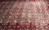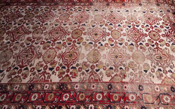 the cream field with allover rosette and cruciform lattice pattern, within red rosette and vine border between bands