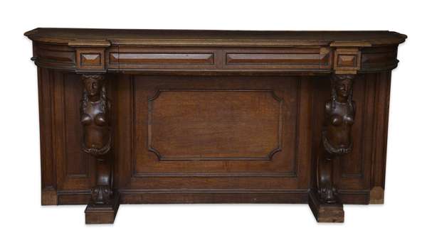 the D-shaped carved top above a panelled frieze, on carved caryatid columns, with panelled back