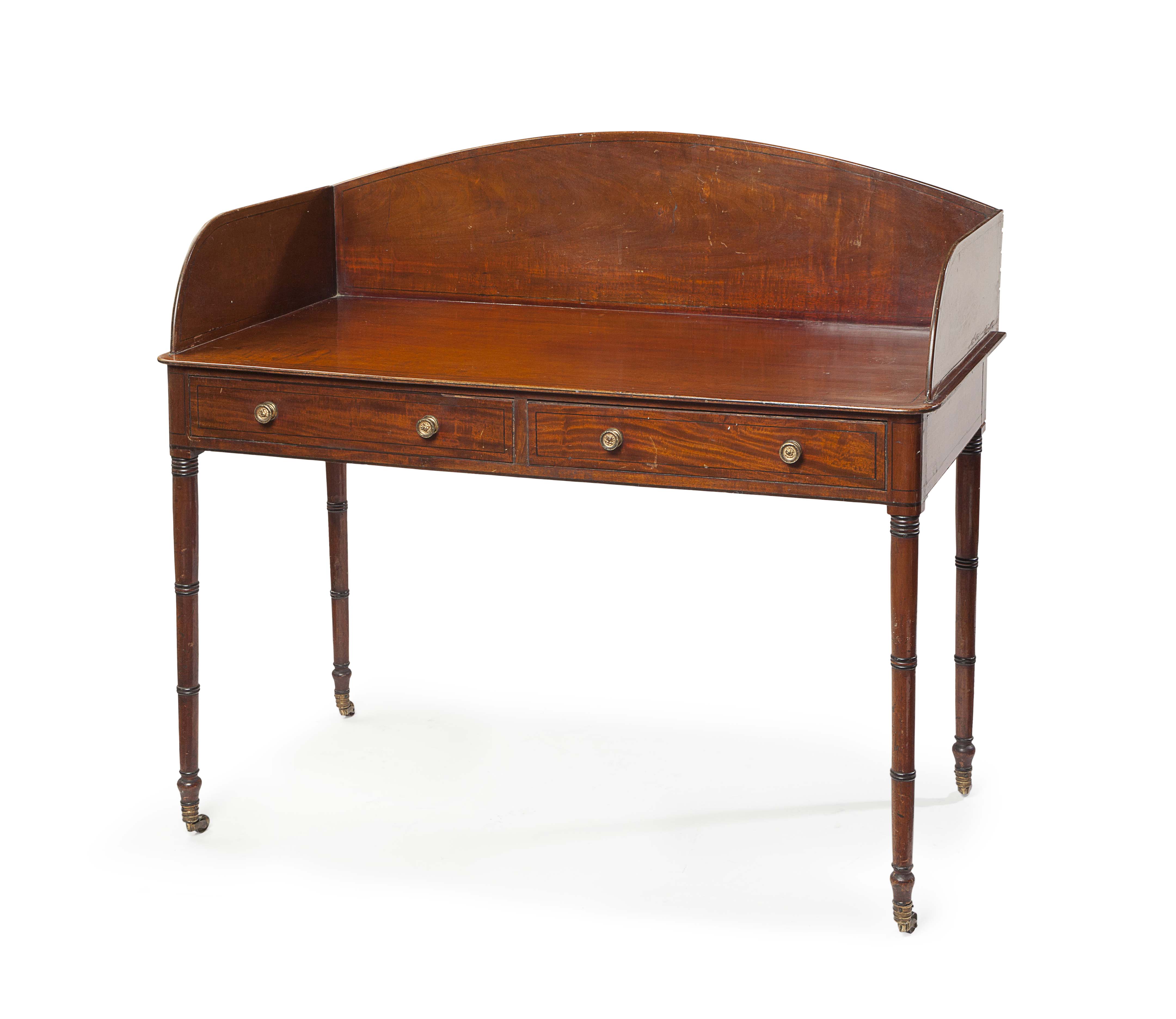 the rounded rectangular top with gallery splashback, over two frieze drawers, on ring turned, on ring turned tapering legs