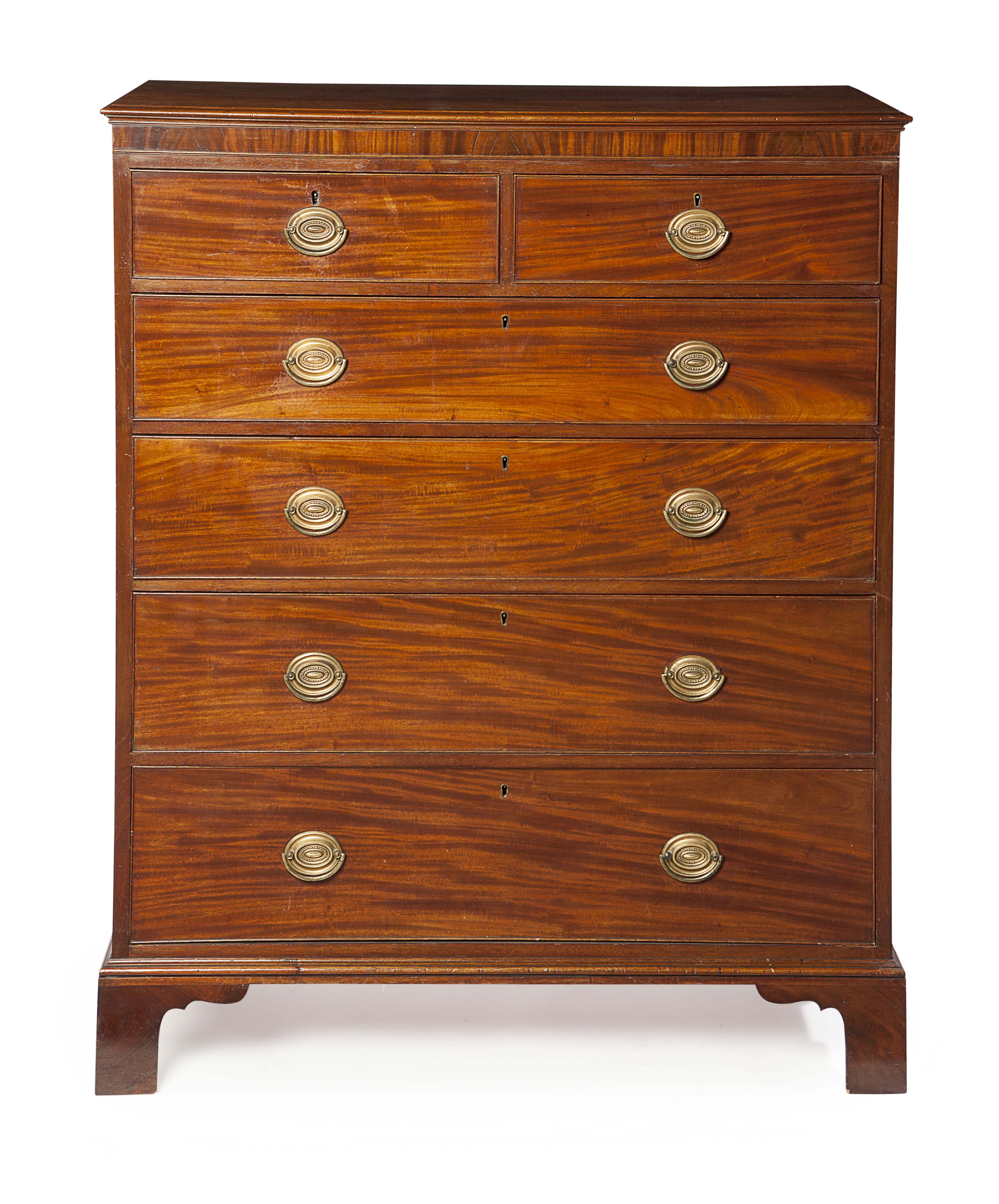 the moulded rectangular top above two short over four long graduated drawers, on bracket feet