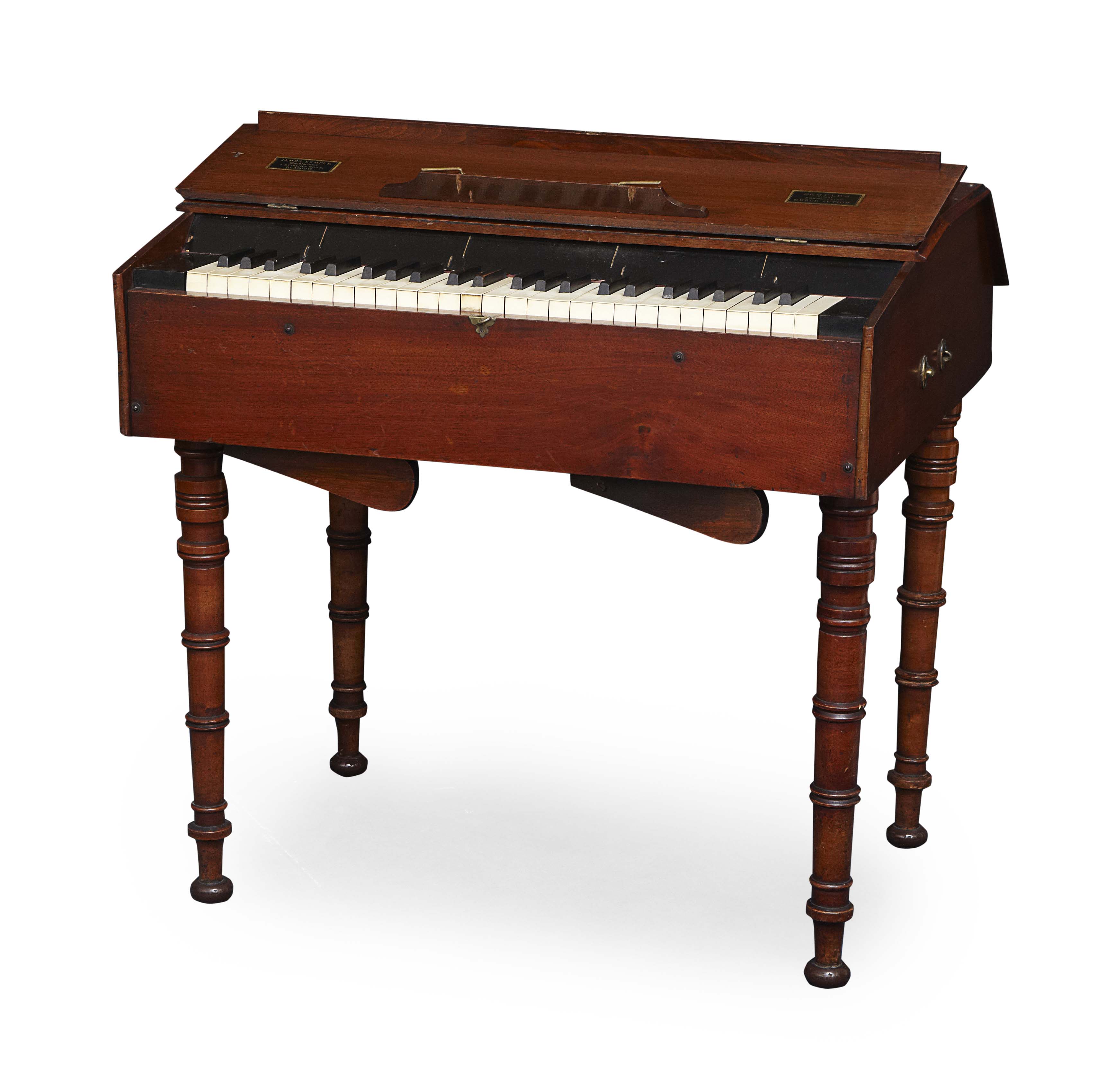 ‘Semples Patent Non-Blocking Action’, the top with three quarter gallery and two sloping hinged covers, one enclosing keyboard, on ring turned tapering legs