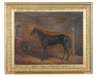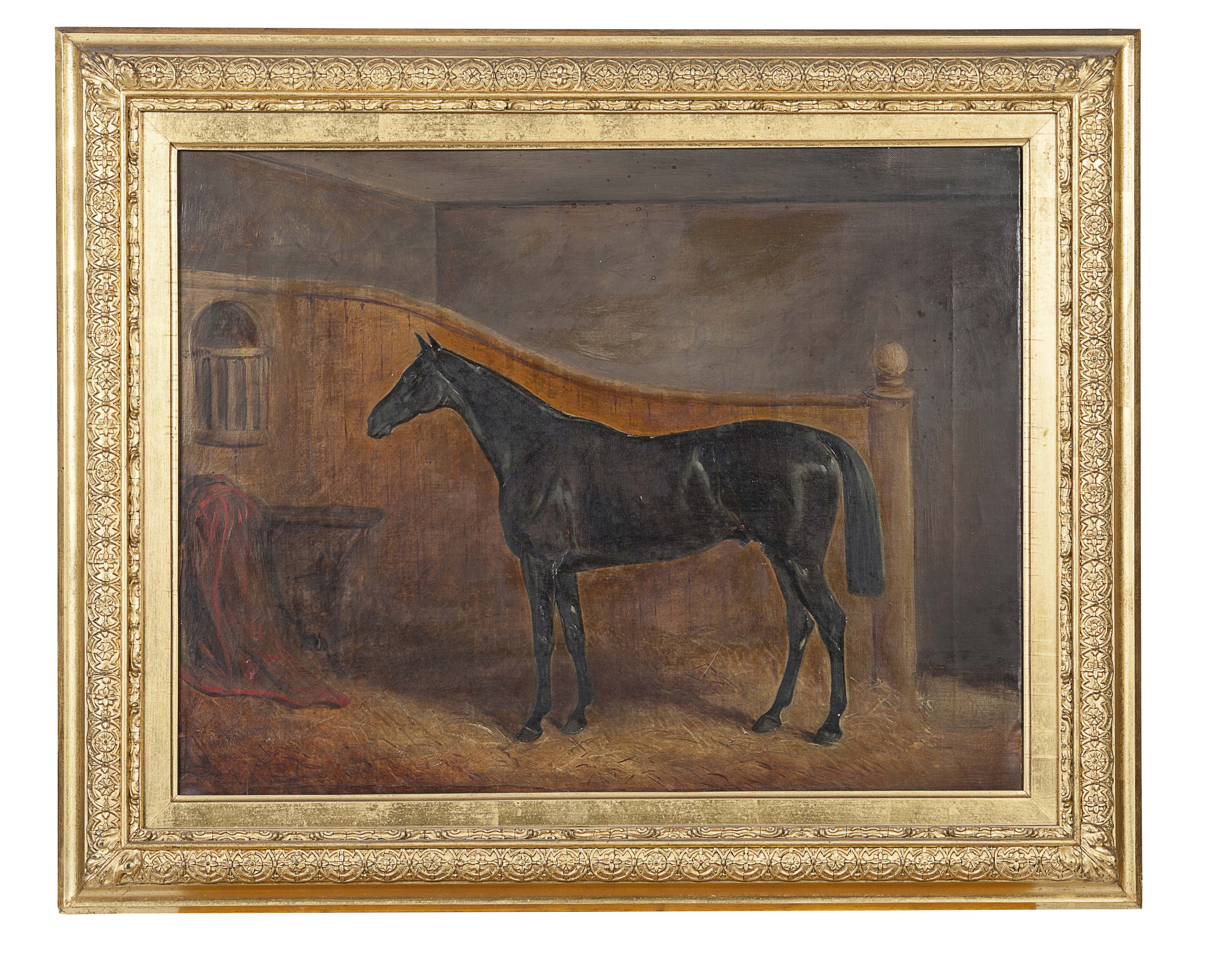 STUDY OF ‘BLACK PRINCE’, A BAY RACEHORSE, IN A STABLE