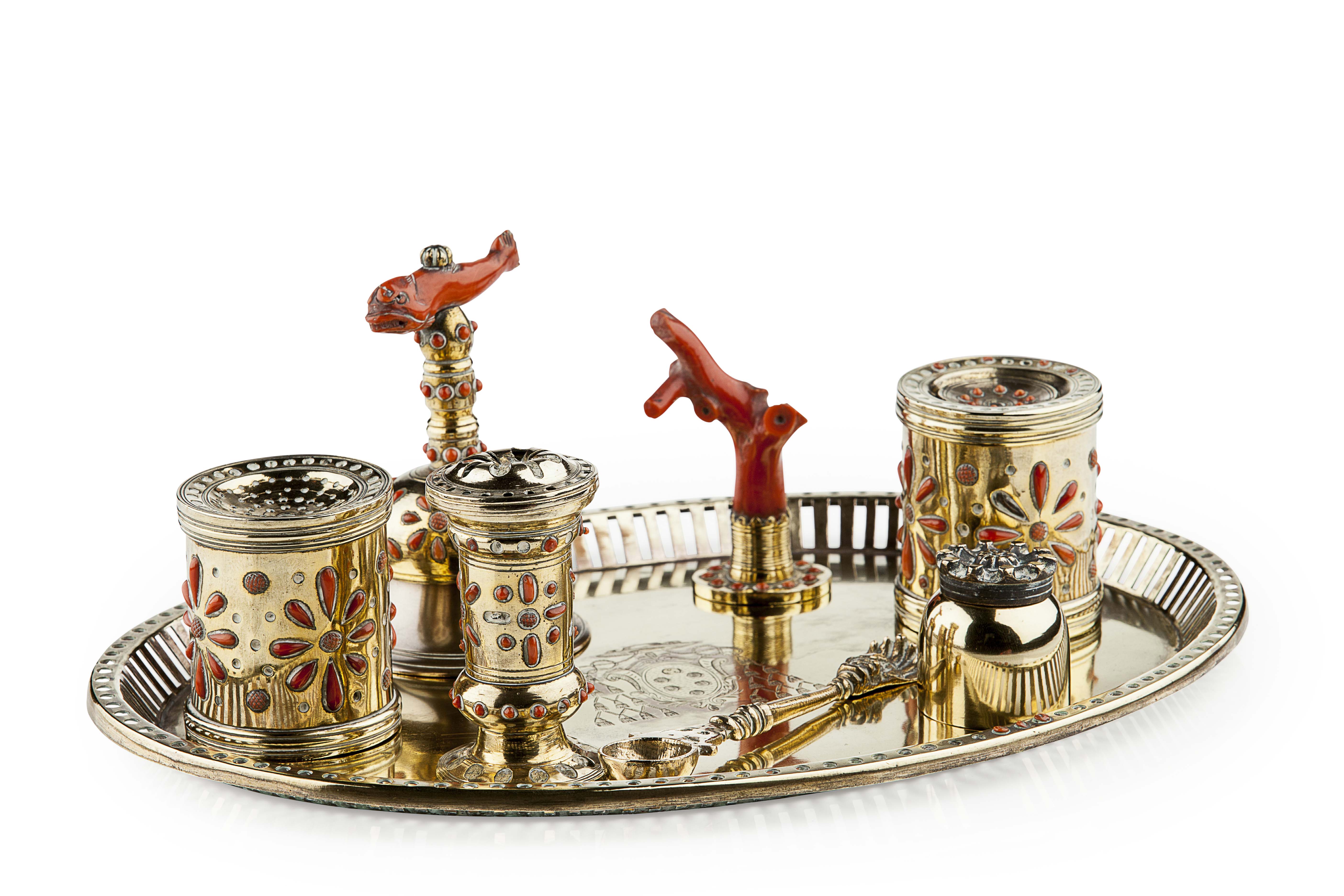SICILIAN TRAPANI GILT METAL AND RED CORAL DESK SET