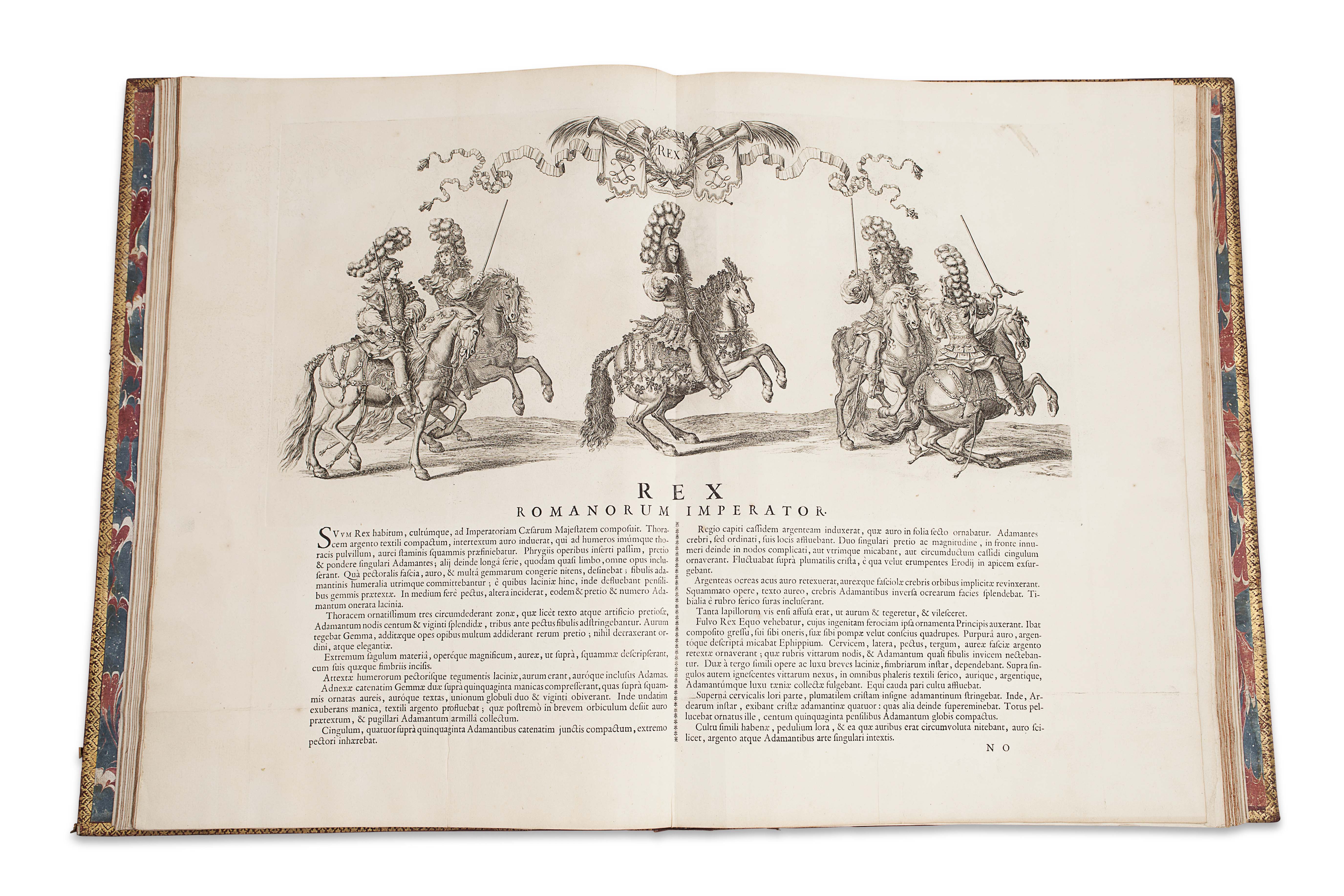 Paris: Typographia Regia, 1670. Folio, additional engraved title, 7 double-page plates, 29 (of 30) engravings of horsemen, 55 small engravings on 10pp, contemporary red morocco, somewhat rubbed and scraped