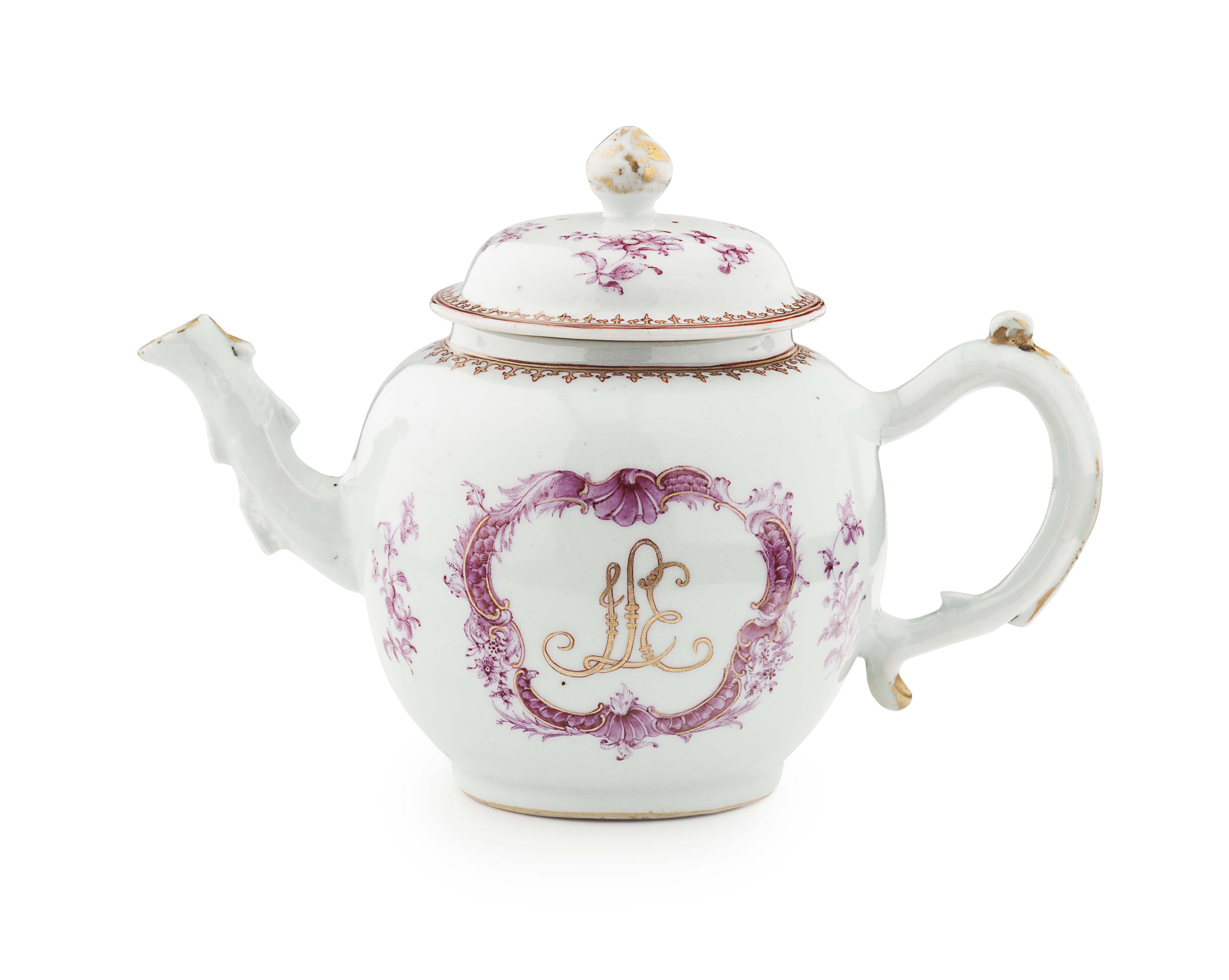 of globular form, the sides painted with foliate and shell puce decoration enriched with gilt, initialled ‘JLE’