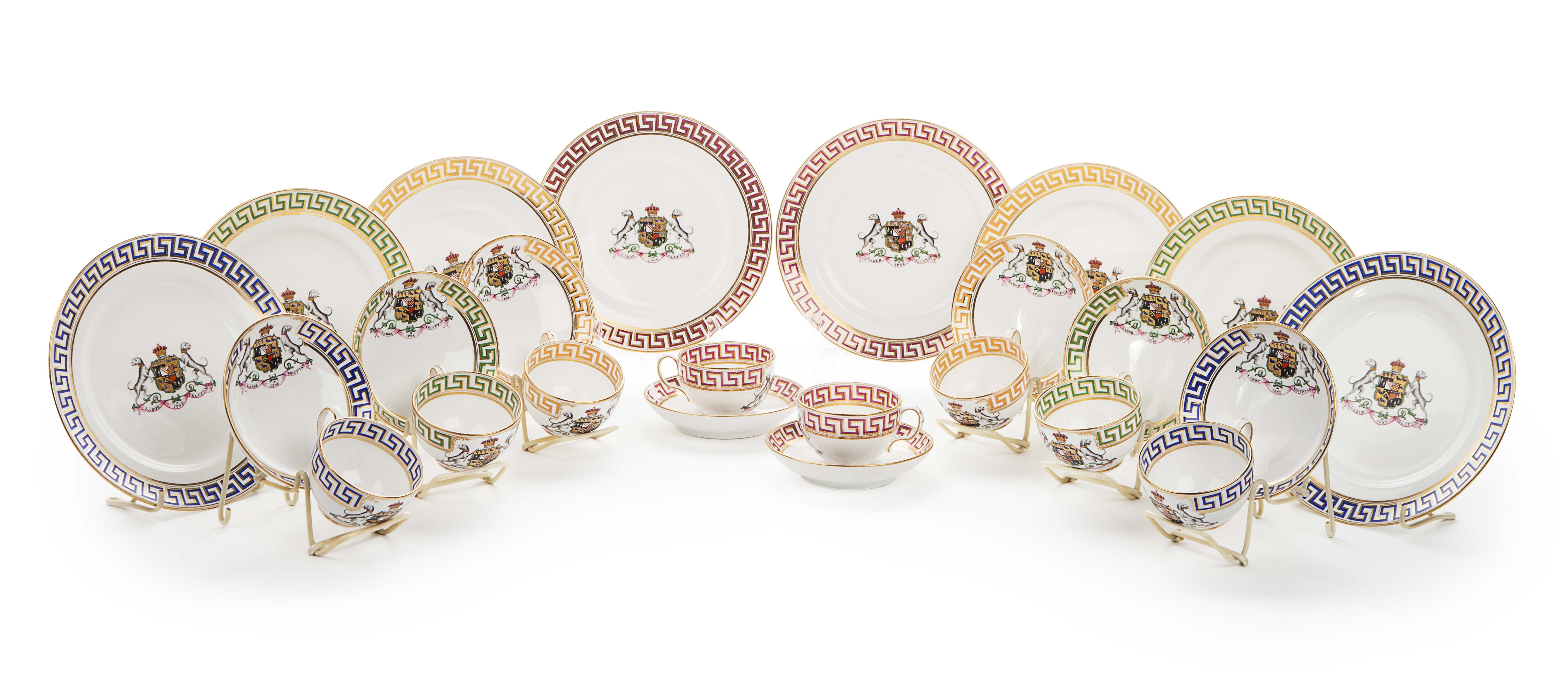 painted with the Lovelace coat of arms, with Greek key borders in four different colours enriched with gilt, comprising: 30 cups, 38 saucers and 12 plates (qty)