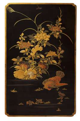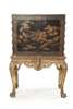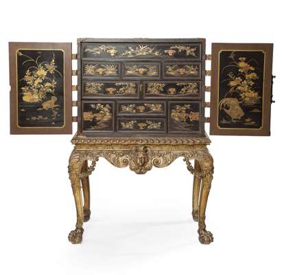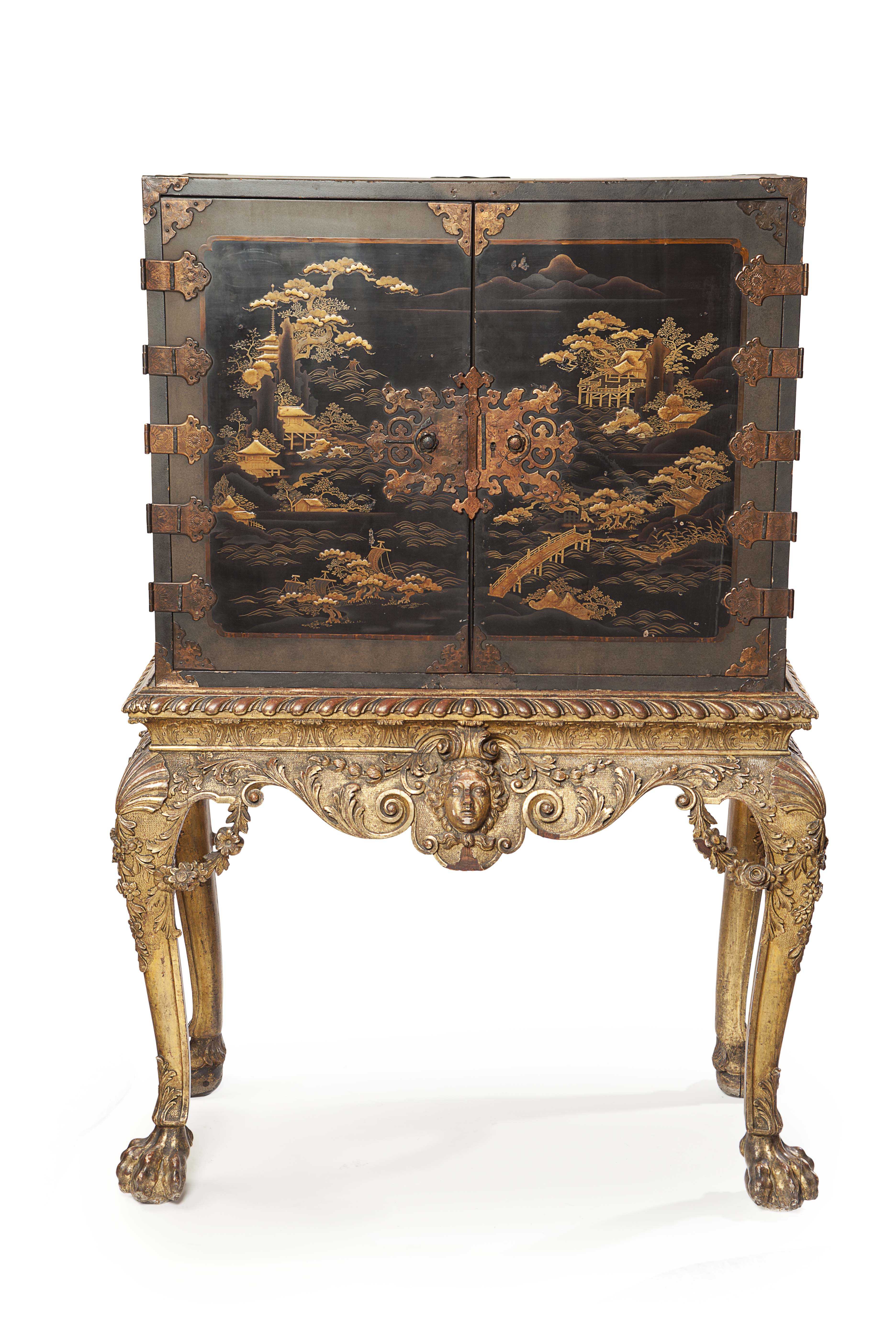 JAPANESE BLACK AND GILT LACQUER CABINET ON ENGLISH GILTWOOD STAND
