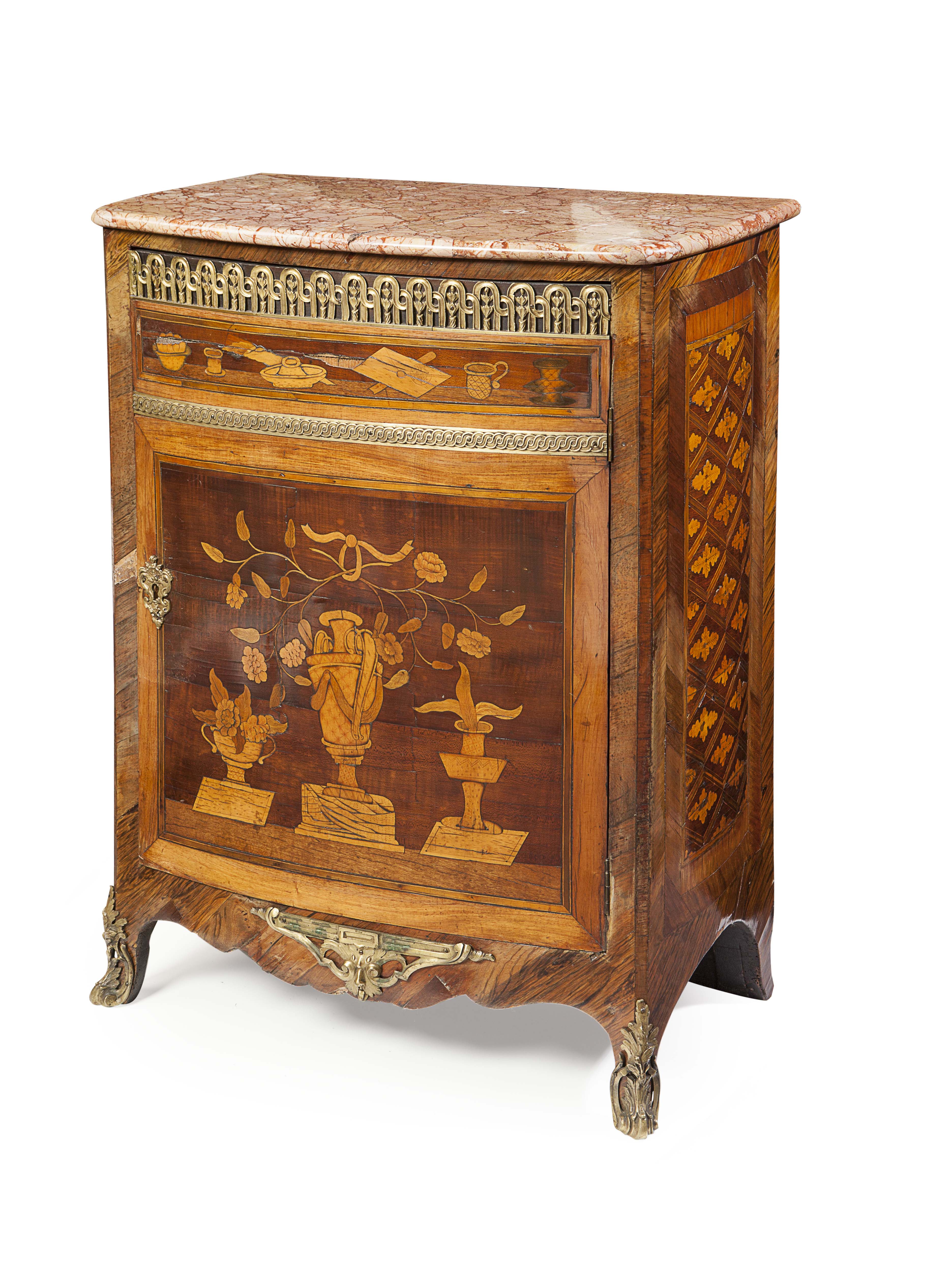 FRENCH LOUIS XV MARBLE TOPPED KINGWOOD AND MARQUETRY GILTMETAL MOUNTED CABINET