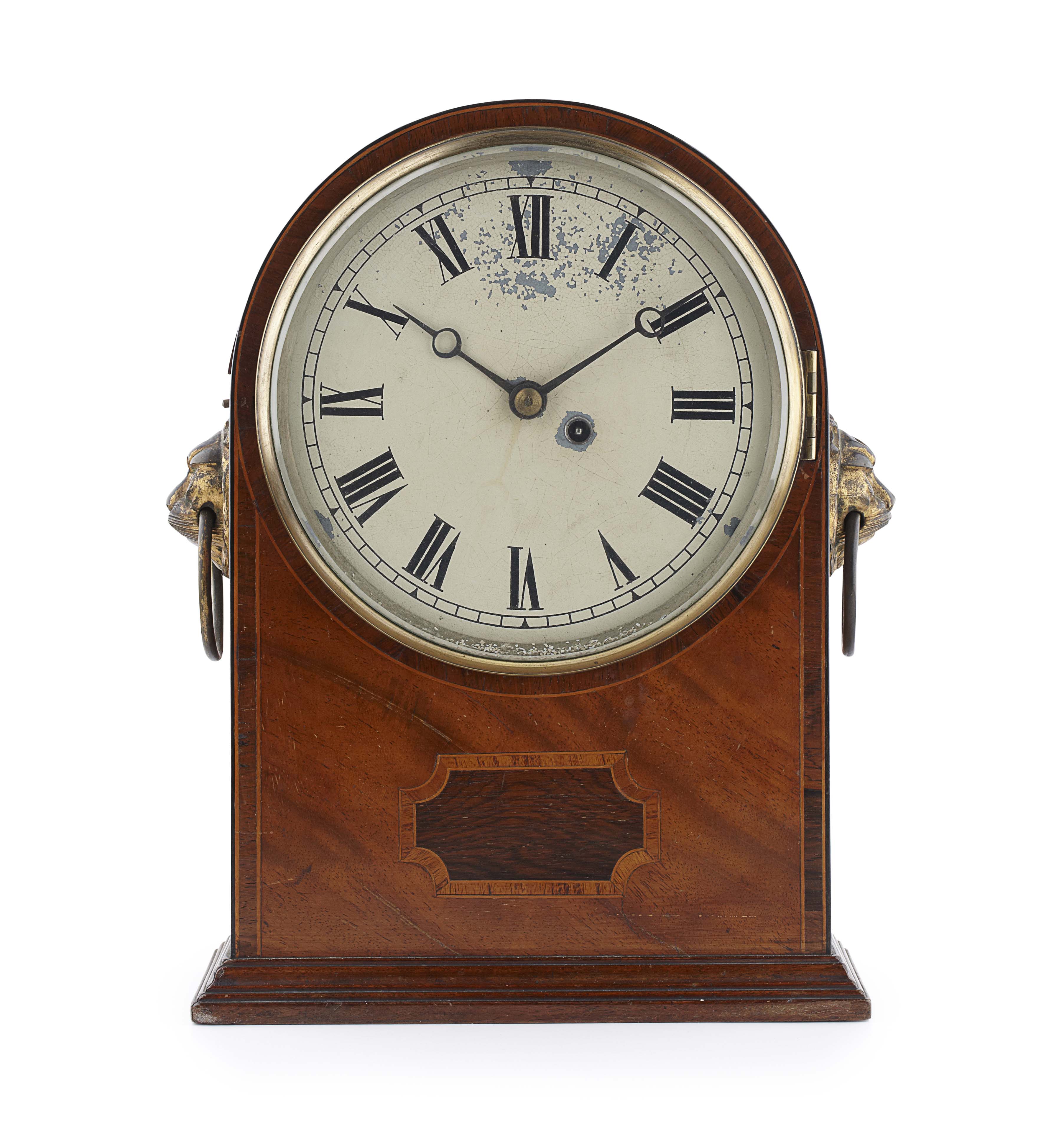 the domed case with white enamel circular dial, over a tablet inlaid base, lion’s head ring handles