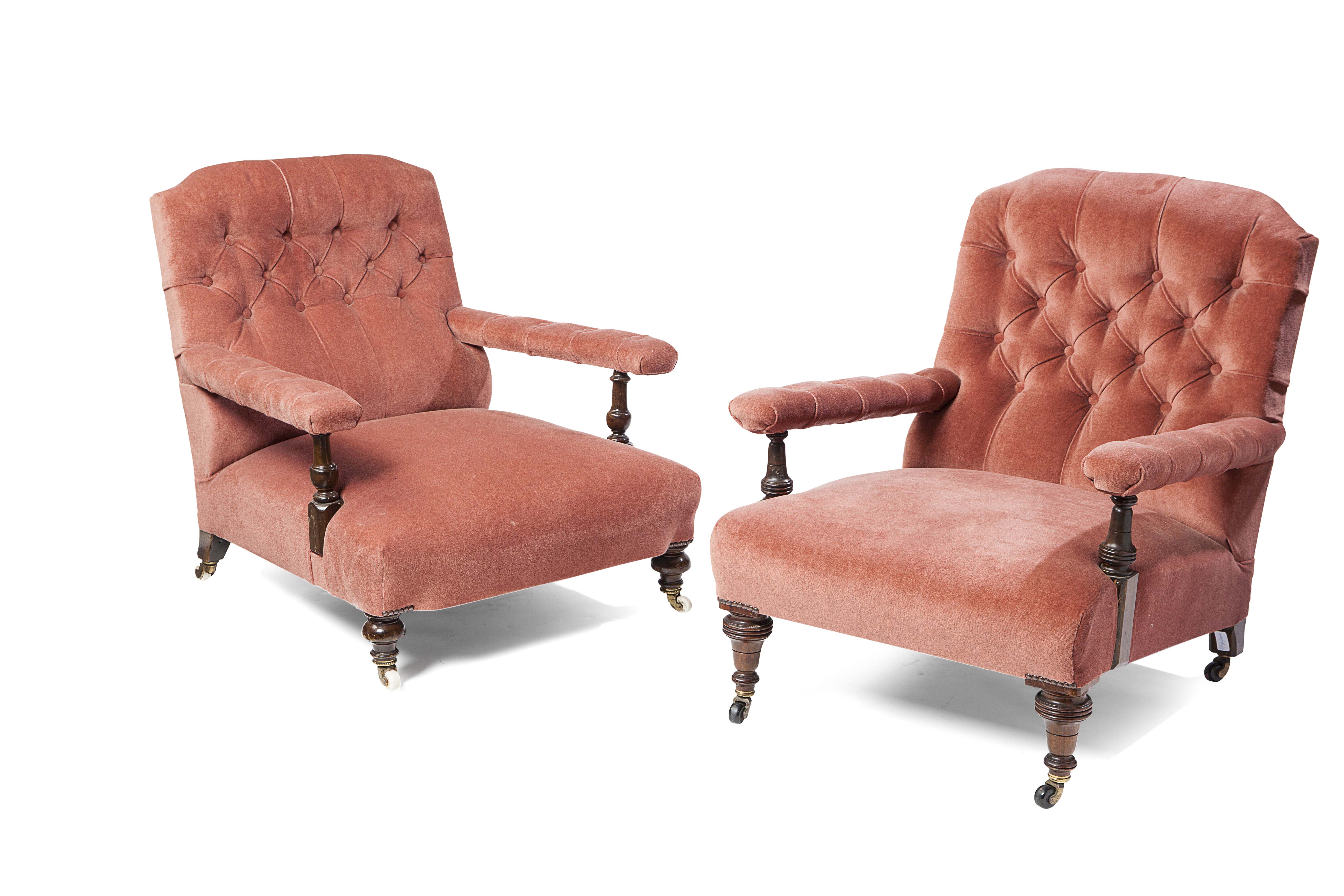 PAIR OF VICTORIAN BUTTON UPHOLSTERED EASY ARMCHAIRS