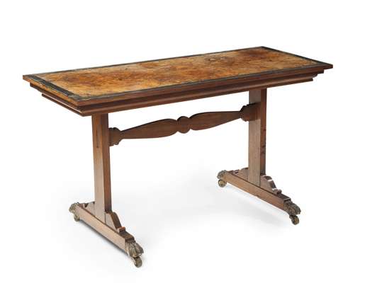with parquetry rectangular top with ebonized banding, on trestle end supports joined by a stretcher, brass paw feet with castors