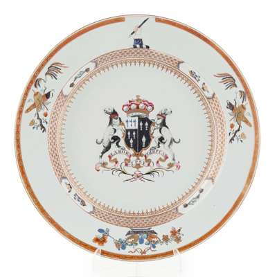 The arms are of King impaling Seys for Peter King, 1st Baron King of Ockham, and his wife Anne, daughter of Richard Seys of Boverton, Glamorgan. They married in 1704. These plates were produced circa 1726 and are the remaining pair from a once larger and now dispersed service.