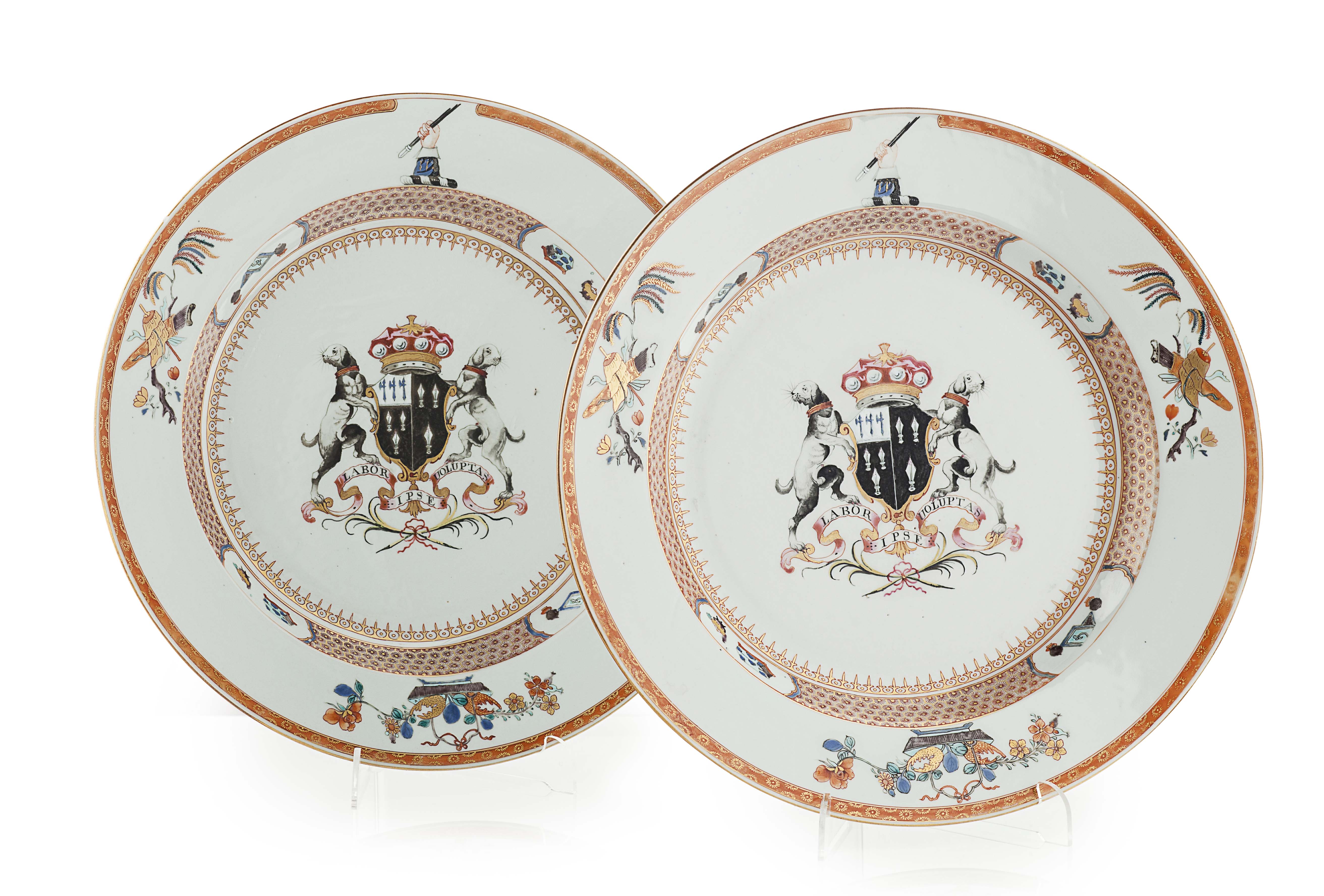 PAIR OF CHINESE EXPORT ARMORIAL PORCELAIN CHARGERS
