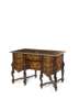 the giltmetal banded rectangular top with floral urn inlay, above a frieze drawer and kneehole cupboard, flanked on each side by three drawers, on scrolled square legs joined by X-stretchers, bun feet