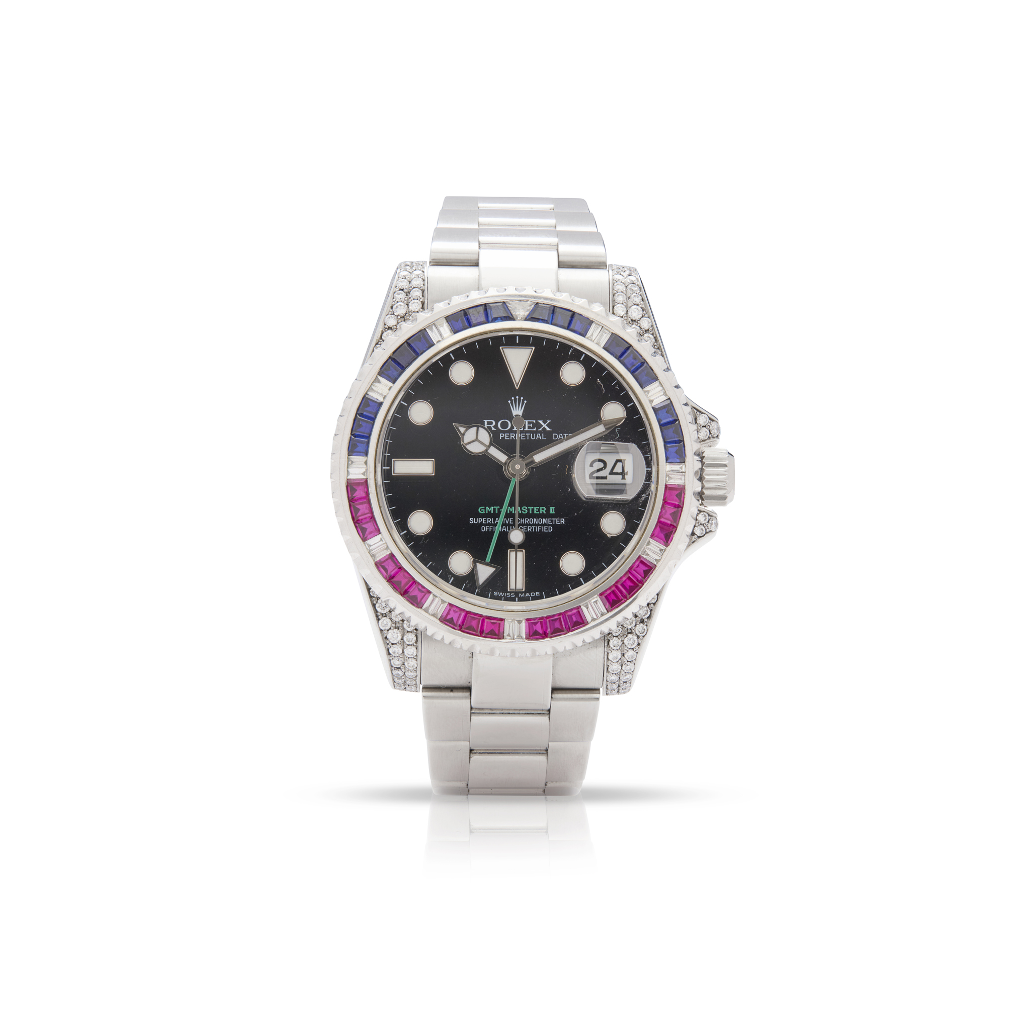 Cal.3186 self-winding 31 jewel movement, gloss black dial with luminous dot, baton and triangle markers, within white gold collets, date aperture, luminous Mercedes hands, luminous triangle tipped green 24hr hand, stainless steel case with screw-down reverse and crown, custom aftermarket stone set shoulders and crown guard, associated red/blue stone set bezel, on fitted stainless steel Rolex Oyster bracelet with OysterLock clasp. Accompanied by a presentation case, guarantee card dated 2009 and a Rolex service card dated 2013.