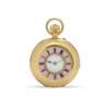 Gilt three-quarter movement, white enamel dial with Roman numerals, blued steel hands, hinged half-hunter case with translucent pink enamel with blue Roman numerals to the cover, time setting pin to the band, plain cuvette, case stamped JR within diamond shape cartouche. With purple presentation box.