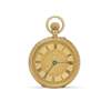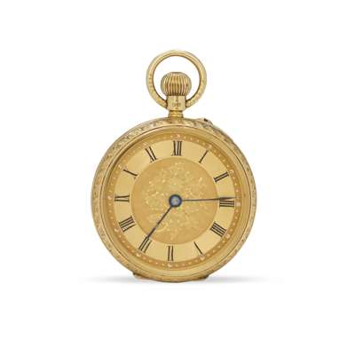 Gilt three-quarter plate movement jewelled to the centre with screwed chaton's, decorative engine-turned gold dial with Roman chapter ring, blued steel hands, finely ornate decorative hinged case with central blank plaque to reverse. With presentation box. PN. The movement hinges out of the front bezel, the reverse does not open.