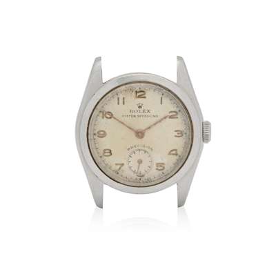 Hand-wound 18 jewel movement timed to 6 positions with Superbalance and fine-regulation, silvered dial with gilt numerals, gilt hands, subsidiary seconds, steel case with presentation inscription to screw-down reverse, screw-down Oyster crown. Case, dial and movement signed.