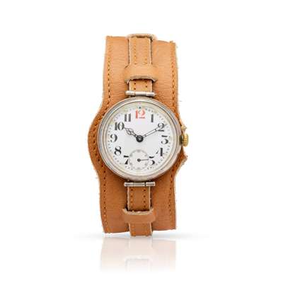 Mechanical hand-wound movement, white enamel dial with black numerals and red 12, subsidiary seconds, outer later drilled for luminous material (not present), skeleton hands, three-piece silvered case stamped by maker GS (George Smith) with screw-down bezel and reverse, hinged lugs. Case numbered.